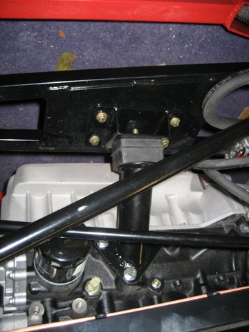 With the spacers and bolts supplied I bolted the engine mounts to the engine block and lowered the engine so that it just rested on the chassis but carried no weight. I had already mated the engine and gearbox and bolted them together once more.