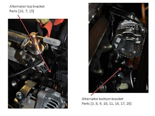 The lower bracket uses the spacer [17] between it and the engine block. The alternator itself is held into the bracket with washers used as spacers.