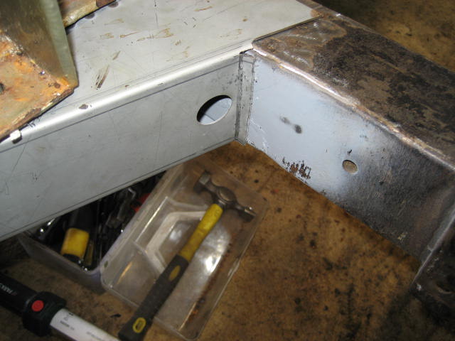 To ensure that the new front tub and repaired chassis fit together via the low tolerance fixing points, I bolted the front tub to the chassis before I started welding the new outriggers in place. Simply getting the tub and chassis to align was hard enough with the outriggers able to move. I think welding first, even with a template, would have left me needing to bodge the tub to fit.